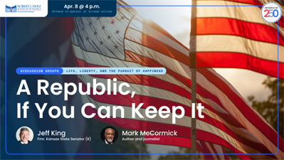 Former Kansas State Senator Jeff King and journalist Mark McCormick will serve together as Spring 2026 Dole Fellows. Their series, “Life, Liberty and the Pursuit of Happiness: Principles that Built a Nation,” will examine principles undergirding America’s founding and evaluate how they shape our world today.