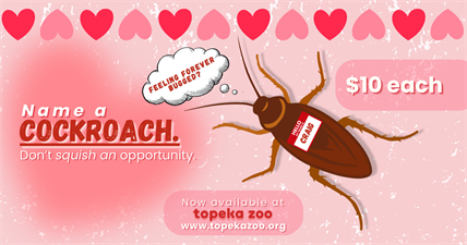 This Valentine’s Day, skip the predictable gifts and name a cockroach at the Topeka Zoo for a $10 or more donation. It’s a playful way to celebrate love, laughter, and a little mischief—while supporting animal care and conservation.