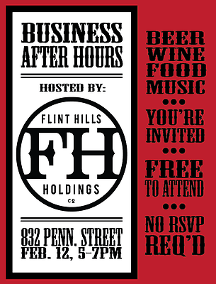 Please join us for our first Business After Hours event of the year, generously hosted by Flint Hills Holdings, L.L.C., Thursday, February 12, at 832 Pennsylvania Street, from 5 to 7PM.