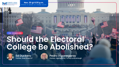 In this edition of The Counselors, attorneys and Dole Institute Visiting Fellows Ed Duckers and Pedro Irigonegaray will debate whether the Electoral College—the means in which the United States elects a president—should be abolished. They’ll be joined a panel of expert witnesses to debate both sides of the issue.